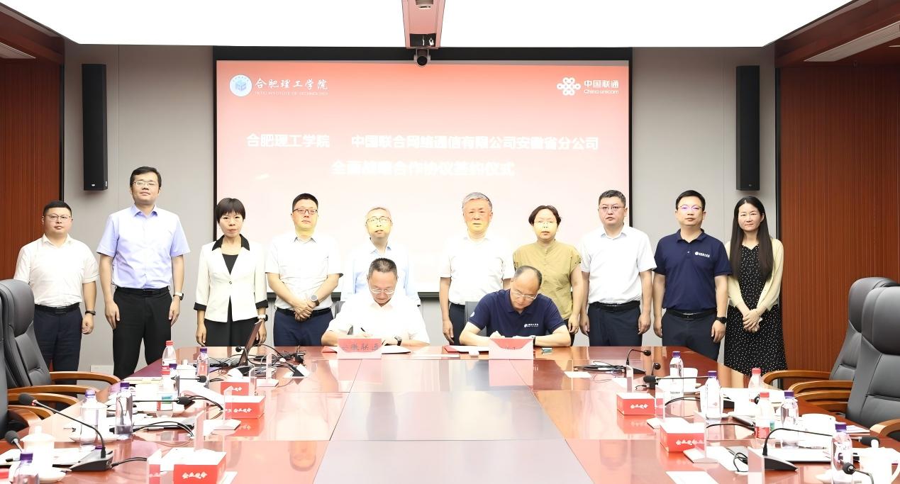2025年7月18日上午,合肥理工学院与中国联合网络通信有限公司安徽省分公司(以下简称“安徽联通”)在安徽联通大楼签署战略合作协议。合肥理工学院党委副书记、院长吴玉程,合肥理工学院党委副书记、副院长李先强,安徽联通党委书记、总经理韩冰,安徽联通合肥市分公司党委书记、总经理蒋海松出席签约活动。