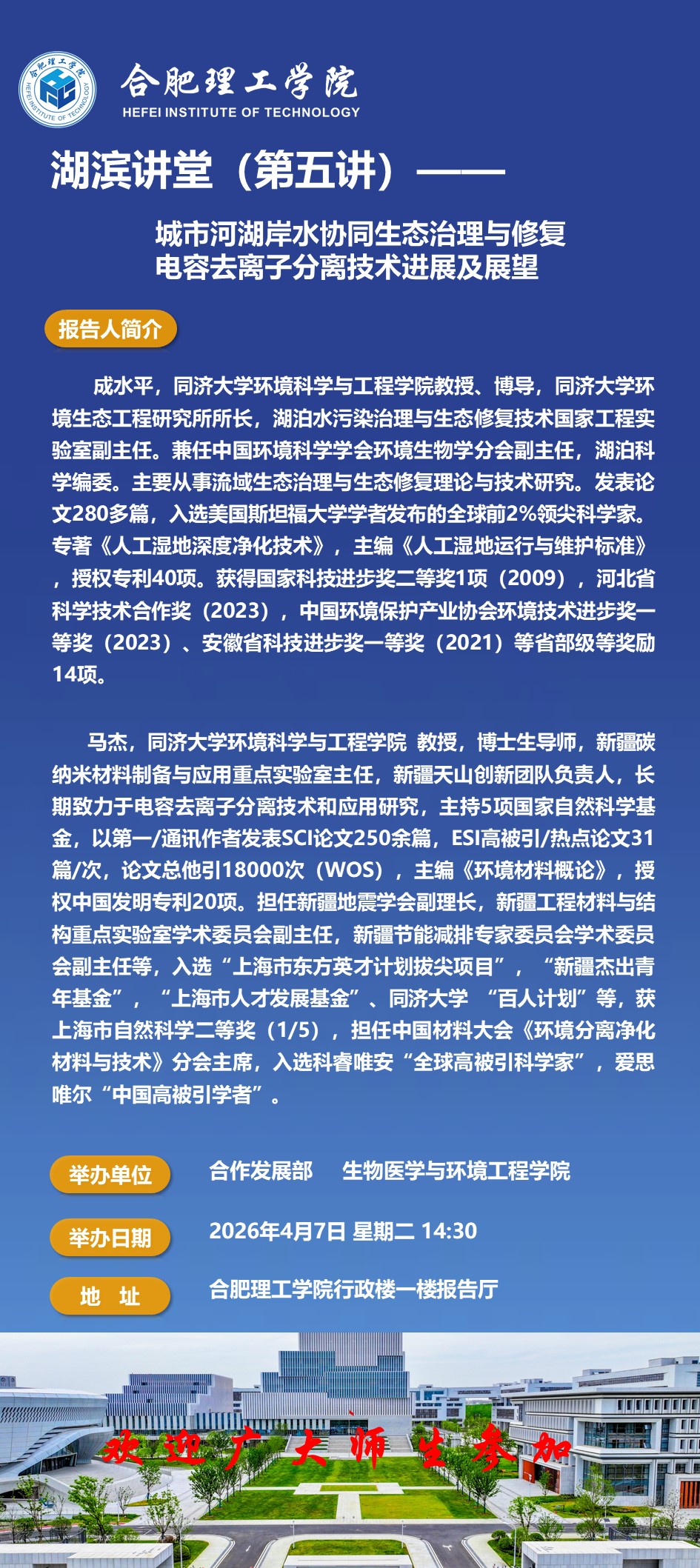 【湖滨讲堂】(第五讲)——城市河湖岸水协调生态治理与修复 电容去离子分离技术进展及展望